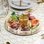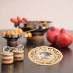 A sophisticated centerpiece with seven compartments labeled for each siman. Available in gold or silver, with a swivel base for easy access. The removable honey dish with a matching spoon completes the look.