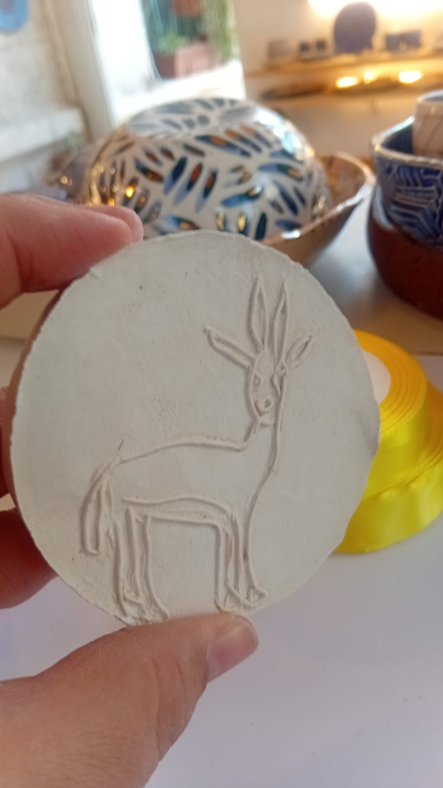 Create your design in clay, wrap it around your plaster mold, press down, remove and the result is a beautiful, personalized plaster piece ready for you to take straight home and enjoy!